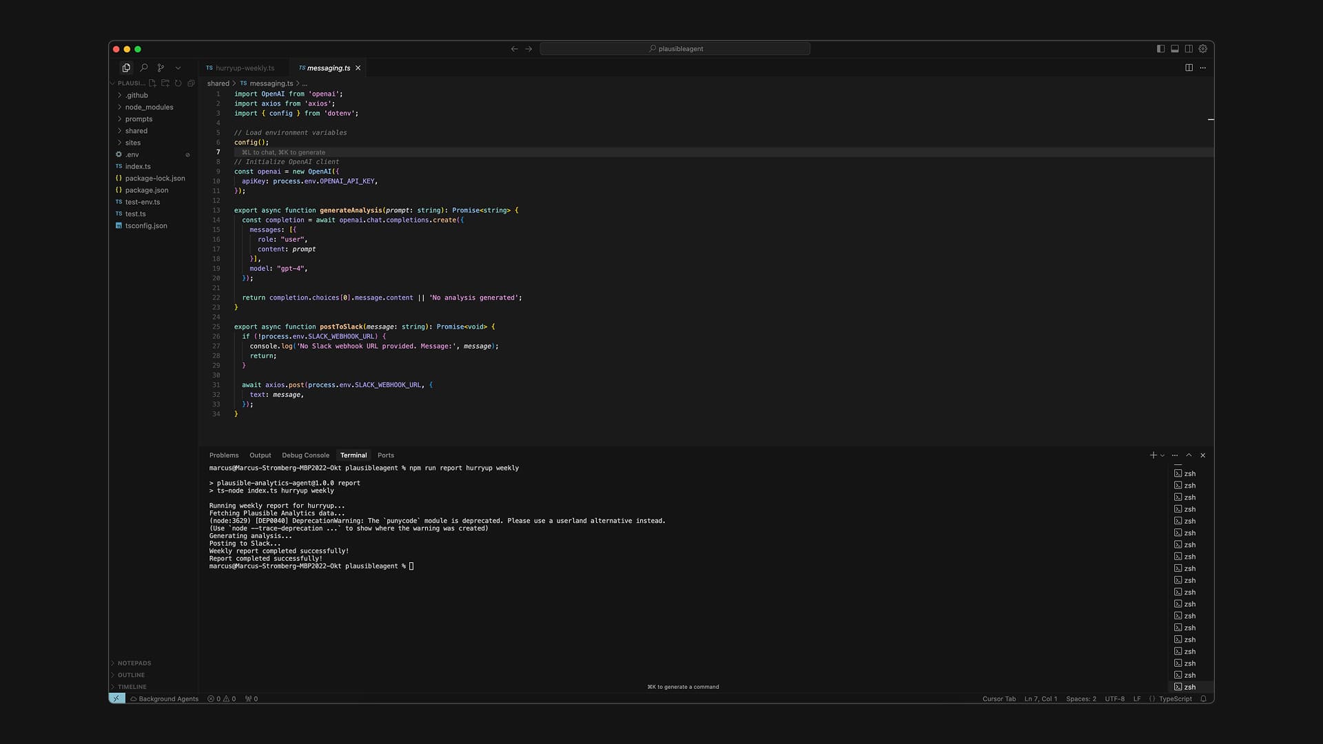 Agenten er bygget med programmeringsspråket TypeScript i kodeeditoren Cursor (les mer om Cursor i min andre artikkel). Strukturen vi har satt opp er laget for å enkelt kunne skaleres og håndtere multi-site-løsninger samt flere ulike rapporter, uten at du trenger å endre noe i grunnstrukturen.