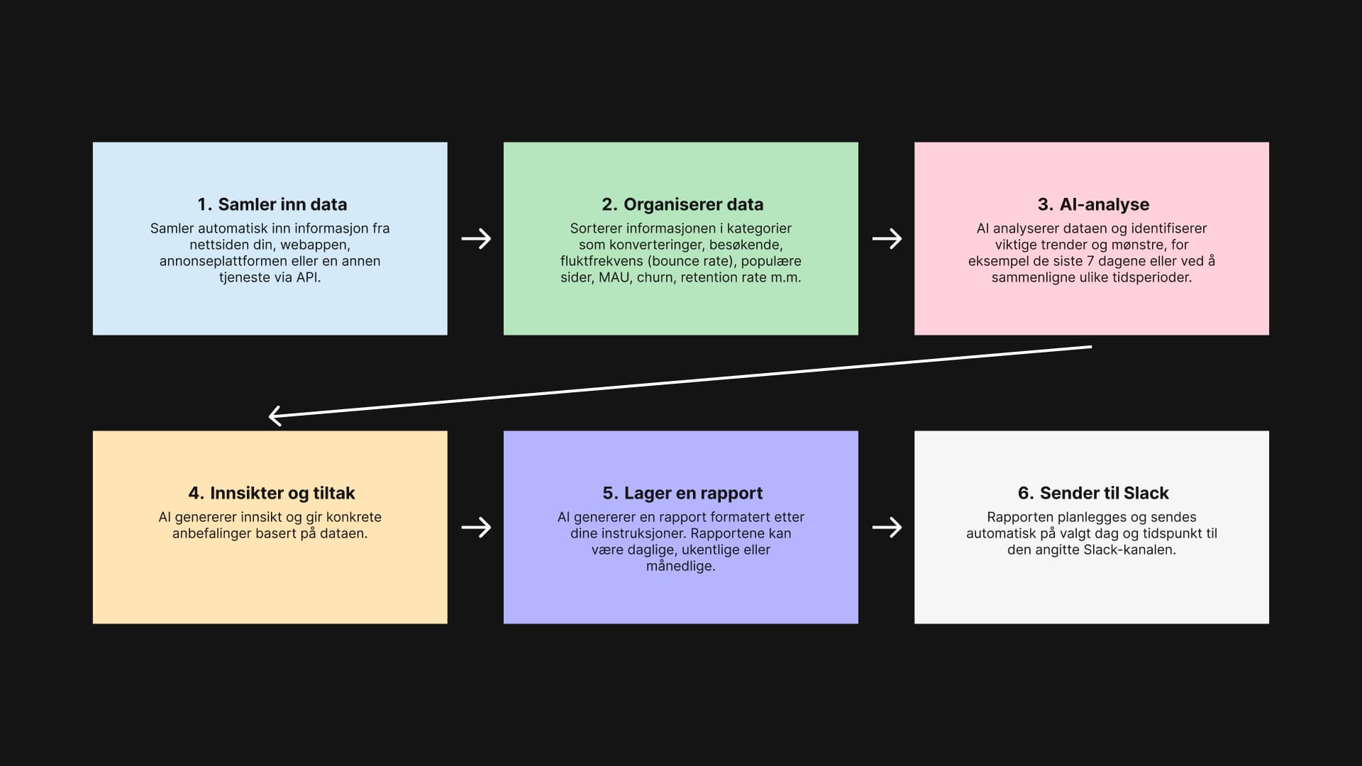 Oversikt over prosessen AI-agenten følger. Fra datainnsamling til ferdig rapport i Slack.