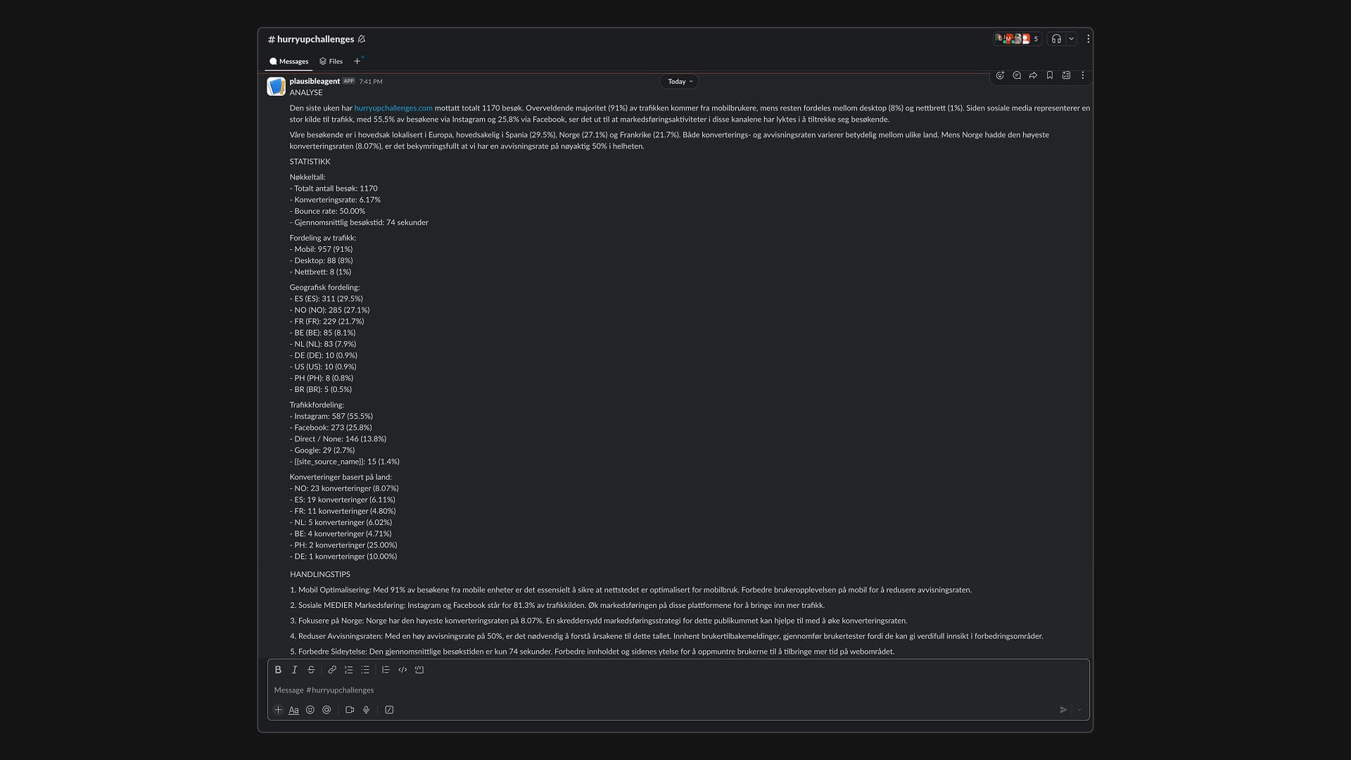 Vi har så vidt begynt å bruke agenten, men vet allerede hva vi sparer. Det som før tok én time i uken, å hente ut data fra Plausible, sammenligne med forrige uke og skrive et sammendrag, gjør agenten nå automatisk. Det tilsvarer rundt 47 timer i året, nesten en hel arbeidsuke.